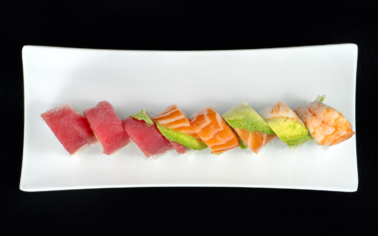 Crab mix, avocado, cucumber, salmon, tuna, shrimp, avocado (8 pieces). RAW